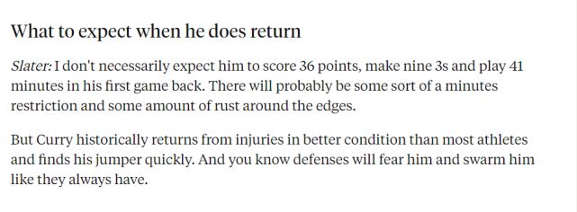 库里回归的第一场比赛,应该会有时间限制,而且他的状态可能会有些生锈。斯雷特表示,自己并不指望能看到他回归首战就砍下36分,命中9个三分或者打上41分钟。