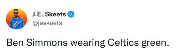 西蒙斯场边轻松观战,有记者调侃他穿着凯尔特人绿。附加赛击败骑士后,篮网的季后赛首轮对手正是凯尔特人。