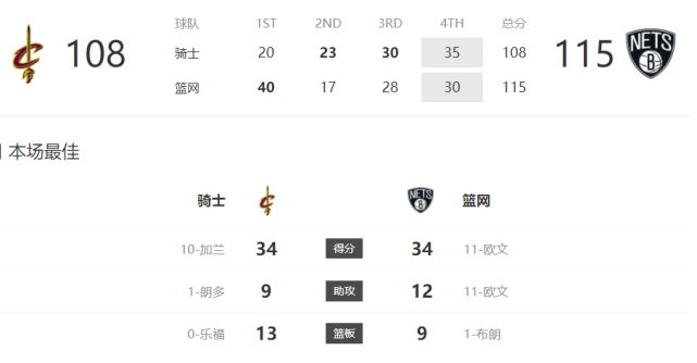 北京时间4月13日,篮网主场115-108击败骑士,赢下附加赛的胜利,以东部7号种子的身份晋级季后赛,他们的首轮对手将是排名东部第2的凯尔特人。欧文15投12中,贡献34分12助攻,他的前12次出手全部命中。杜兰特贡献25分11助攻。篮网最多领先骑士22分,骑士末节一度缩小分差到个位数,还是不敌篮网。骑士将对阵老鹰和黄蜂附加赛的胜者,争夺东部最后一个晋级季后赛的机会。