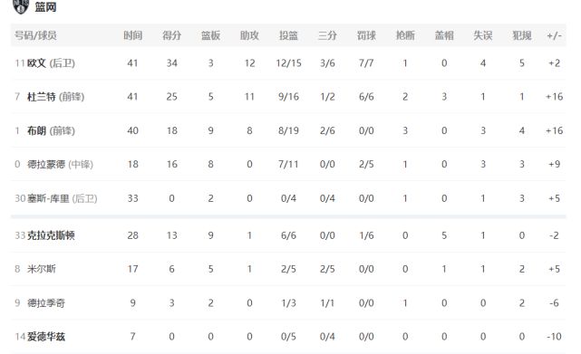篮网:欧文34分12助攻,杜兰特25分5篮板11助攻2抢断3盖帽,德拉蒙德16分8篮板,布朗18分9篮板8助攻3抢断,克拉克斯顿13分9篮板5盖帽