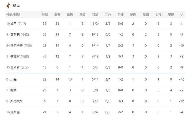 骑士:加兰34分5助攻2抢断,莫布利19分7篮板2盖帽,乐福14分13篮板,马尔卡宁13分3抢断,勒维尔12分7篮板7助攻,朗多7分9助攻
