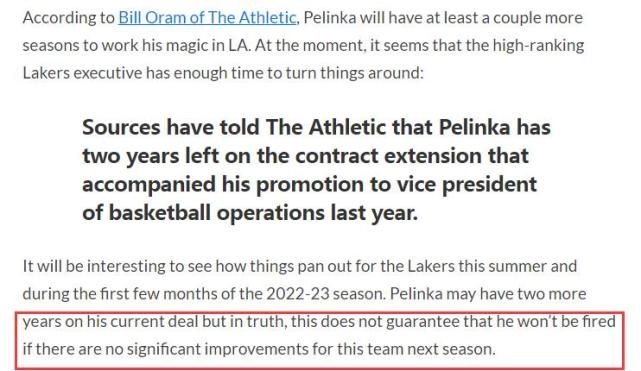 湖人解雇了主帅沃格尔,但是在许多人看来,沃格尔是替湖人管理层背锅了。美媒The Athletic记者比尔·奥拉姆报道了湖人总经理佩林卡的合同情况,还剩下2年。而美媒clutch points认为,下赛季对于佩林卡来说是大考验,如果球队没有显著改善,那么他可能被解雇。
