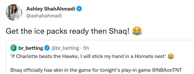 不得不说,奥尼尔真的很搞笑,球员时期就擅长活跃气氛,退役后担任解说嘉宾更是如此。奥尼尔的这番话,显然是非常看好老鹰,但也很快引起黄蜂球迷和记者的不满。夏洛特记者Ashley转发了奥尼尔的言论,评论道:“给沙克准备好冰袋!”