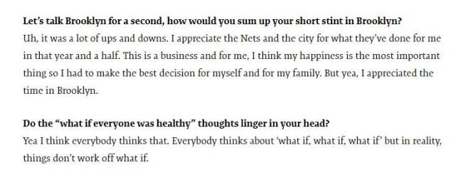记者询问了哈登在篮网的时光。哈登回答:“经历了很多起起伏伏,我感谢篮网和这座城市在这一年半里为我所做的一切。对我来说,这就是一次生意,我认为我的快乐是最重要的,所以我必须为我自己和我的家庭做出最好的决定。当然,我很享受在布鲁克林的时光。”