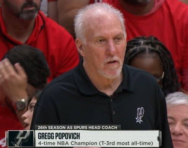 在如此备受瞩目的全美直播大战,马刺客场挑战鹈鹕,而转播方在介绍波波维奇时,写的是,“4届NBA总冠军主教练,并列历史第3位,第26个赛季作为马刺主教练执教。”