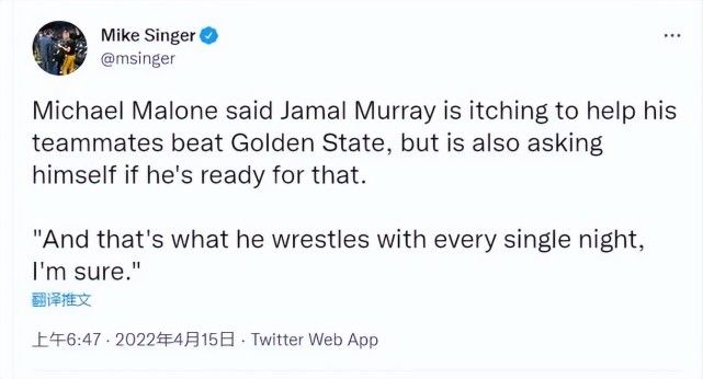 掘金后卫穆雷也渴望复出,对于他的复出可能性,马龙表示:“他渴望帮助队友击败勇士,他每天都在问自己是否可以复出。我敢肯定,这就是他每天都在为之努力的事。”不过,到目前为止,掘金还没有确定是否让穆雷在首轮第一战复出。掘金将在4月17日上午8点30分客场挑战勇士,进行系列赛第一回合较量。