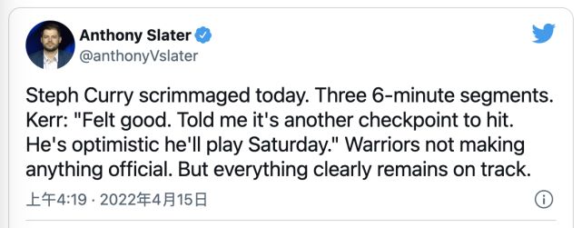 不过好消息是,目前库里已经恢复个人训练以及投篮训练,这肯定成为库里重返赛场的关键步骤。据美媒安东尼-斯莱特的说法,库里在北京时间4月15日勇士队内训练日参加了5对5的训练: