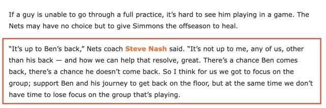 作为主教练的史蒂夫-纳什在谈及本-西蒙斯的复出可能性时表示: