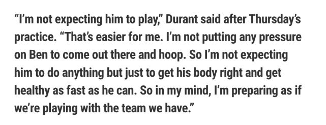 另一方面,作为球队当家巨星的凯文-杜兰特也谈及西蒙斯的伤病: