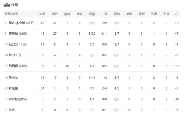 快船:雷吉27分7篮板8助攻2抢断,莫里斯27分9篮板5助攻,鲍威尔17分,科温顿14分