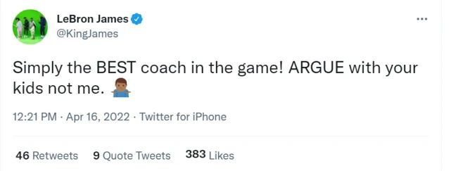 比赛末节,詹姆斯发推:“他就是最佳教练!和你们的孩子去争论吧,别和我争。”