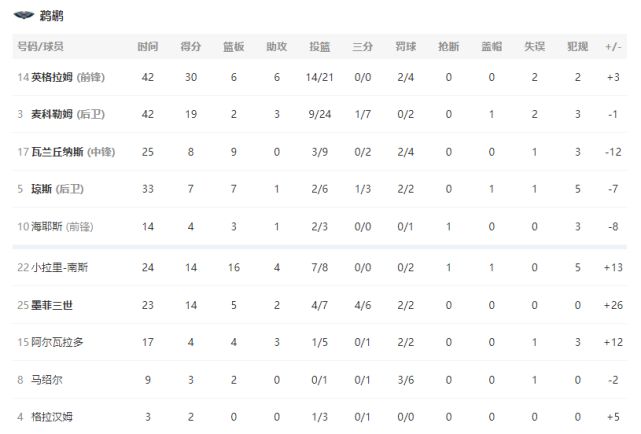 鹈鹕:英格拉姆30分6篮板6助攻,小南斯14分16篮板,麦科勒姆19分,瓦兰丘纳斯8分9篮板,墨菲14分