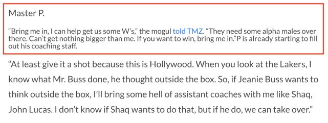 正因为如此,说唱歌手Master P在接受采访时调侃道,自己完全可以与湖人传奇名宿沙克-奥尼尔联手担任湖人新任主教练:
