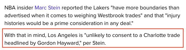 只是据美媒马克-西坦因的说法,湖人“不太可能同意黄蜂以戈登-海沃德作为核心筹码进行交易”。
