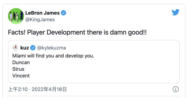 另一方面,湖人当家巨星勒布朗-詹姆斯在观看热火季后赛首轮对阵老鹰的首场比赛后发推称赞这些球员的成长: