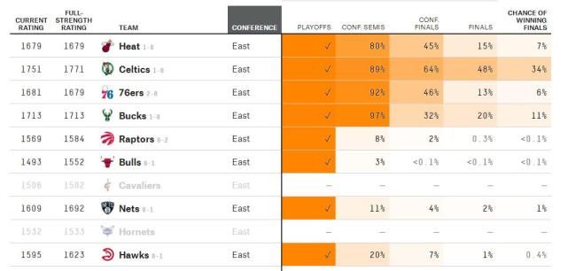 猛龙97-112不敌费城后,登帝手握2-0的领先优势,这也让费城晋级的概率提升到92%。