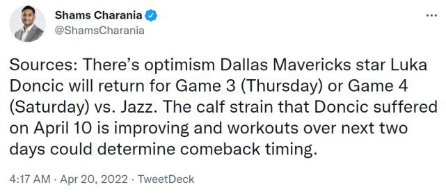 东契奇在常规赛的最后一战中意外受伤。原本他的技术犯规次数已满,那场比赛该自动停赛,但随着联盟撤销了他的技犯,他最终还是出战,但由于小腿拉伤,他错过了对爵士季后赛的前两场。