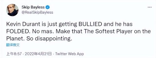 但是,很遗憾杜兰特依然状态不佳,贝莱斯继续狂喷:“杜兰特被欺负了,他已经弃牌了。别这样了!世界上最软的人,太令人失望了。”