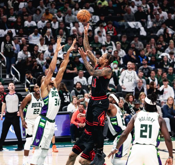 此役,德罗赞面对字母哥的防守,他疯狂奉献9中8的疯狂投射,唯一投丢的一球是被字母哥完成一记遮天大帽,而其余8次出手德罗赞全部命中。更为关键的是,在比赛进行到最后时刻,德罗赞在此前已经突破造犯规两罚全中,还在之后迎着字母哥的防守封盖,直接突破到篮下完成拉杆上篮命中,如此一球成为公牛赢球的关键一击。