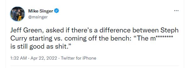 赛前,掘金球员杰夫-格林接受了采访,他被记者问到库里打首发和替补的区别,他爆粗回应道:“,他TMD都打得好到不得了!”在G1和G2的比赛中,库里都打的是替补的位置。