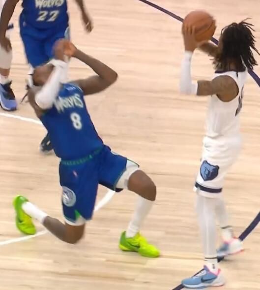 在被森林狼打出14-0后,莫兰特突破跳起分球底角贝恩命中了一个稳定军心的三分球。