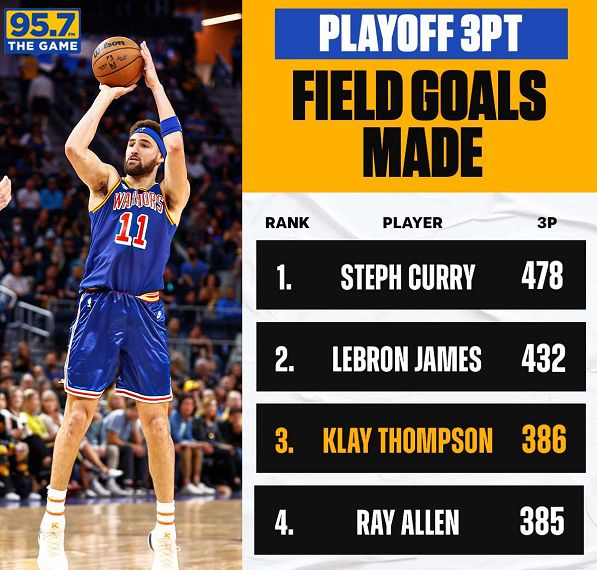 汤神前三节命中4记三分,末节继续命中三分,他季后赛生涯已经命中387记三分,超越传奇射手雷-阿385记三分纪录,升至NBA季后赛历史第3位,仅次于前两位的库里480记三分与詹姆斯432记三分。