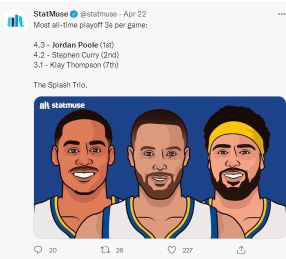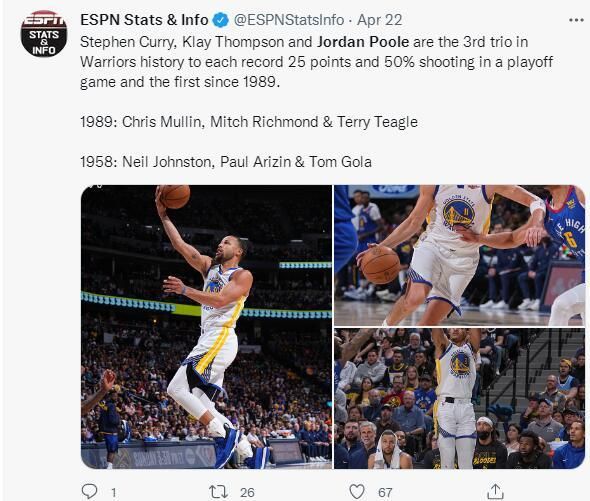 3.克莱、普尔、库里三人在季后赛中各拿下25分+命中率超过50%,成为1989年穆林、里奇蒙德、蒂格尔与1985年的尼尔、阿里金、戈拉后第三组。