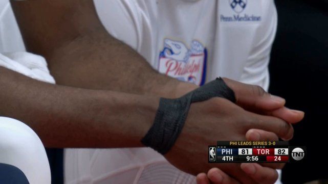 前方信号特写恩比德的右手,他的拇指初步检查有韧带损伤,返回费城后将接受核磁检查。