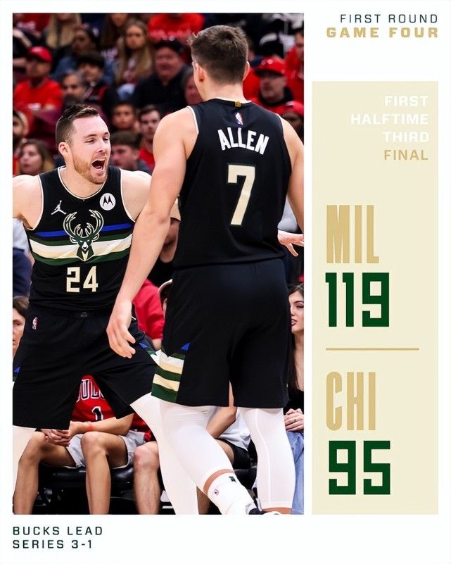 北京时间4月25日,雄鹿以119-95击败公牛拿下关键的G4,此役后雄鹿3-1大比分领先公牛。字母哥轰下32分17篮板7助攻2盖帽,霍乐迪26分7助攻6个三分,格雷森-阿伦拿下27分+6个三分球,雄鹿一直牢牢掌控局面,拉文是这场比赛公牛少有的亮点了,全场比赛拿下24分13助攻。