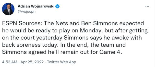 西蒙斯此前复出的时间有多个版本,有记者表示他最快G3复出,也有记者称他要等到G4或者G5才能上演首秀。现在篮网的态度似乎是不想冒险让西蒙斯复出了。此前西蒙斯因心理问题和背部伤病缺席了大量比赛,本赛季还没上演首秀。