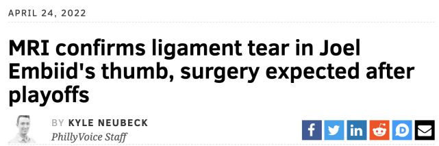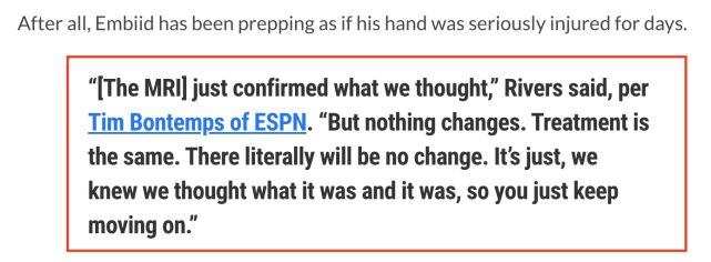 即便这只是拇指的伤病,但这是否会对乔尔-恩比德接下来的比赛造成影响还有待观察。