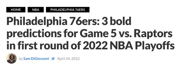 最后需要谈及的是,美媒山姆-迪乔瓦尼对76人接下来对阵猛龙的第5场比赛作出以下3个大胆预测: