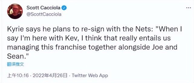 4月26日,篮网112比116输给凯尔特人,从而0比4被横扫。赛后欧文的言论引发了争议,他放言自己要续约,自己和杜兰特会和老板蔡崇信以及总经理马科斯一起管理球队。欧文这是把自己当成篮网老板了?