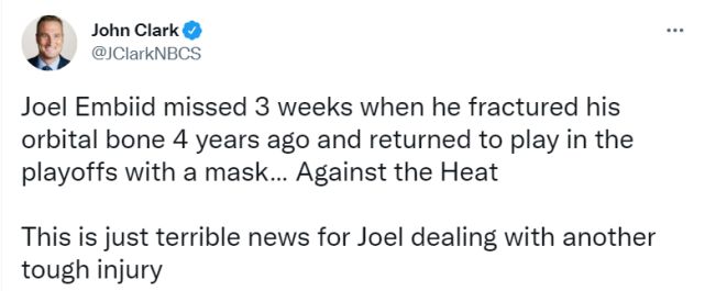 76人官宣:恩比德遭遇右眼眶骨折和轻微脑震荡