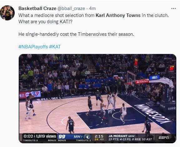 森林狼球迷直言:唐斯在关键时刻的出手选择稀烂,他直接毁掉了森林狼整个赛季。
