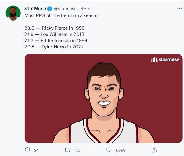 北京时间5月4日,NBA官方公布了最佳第六人奖项的获得者,热火球员泰勒-希罗拿下了2021-2022赛季的最佳第六人。他本赛季常规赛场均拿下20.8分5篮板4助攻0.7抢断。季后赛次轮第一场中他17中9轰下25分,刚刚成为热火赢得比赛的大功臣。
