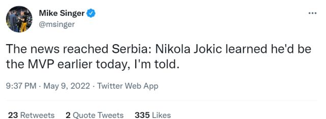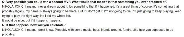 Mike Singer还报道称,自己在首轮第5战赛后曾经问过约基奇:如果再次当选MVP,他会如何庆祝?当时约基奇的回答是:“很可能是和亲友在一起,享受一些音乐和啤酒。应该和你想做的是一样的。”