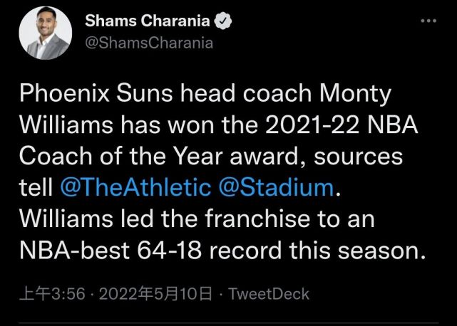 北京时间5月10日,太阳球星德文-布克更新社媒,提前透露太阳主帅蒙蒂-威廉姆斯当选2021-22赛季最佳主教练的消息。布克模仿名记沃纳罗斯基昨天公布约基奇的格式写道:“太阳主帅蒙蒂-威廉姆斯已经被票选为联盟本赛季的最佳主教练,布克告知消息源。联盟的正式公告预计在今天晚些时候宣布。”