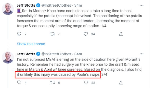 Jeff Stotts还表示,莫兰特在选秀前接受过膝盖手术,还因为膝盖酸痛缺席过3月和4月的一些比赛。最后,Stotts基于诊断结果给出了结论:莫兰特这种伤病基本不可能是普尔那个动作造成的。其实,灰熊的官方报告里没有写上莫兰特因何受伤,只说他膝盖酸痛退场,也从侧面表示了他们并不能认定普尔造成莫拉特的骨挫伤。