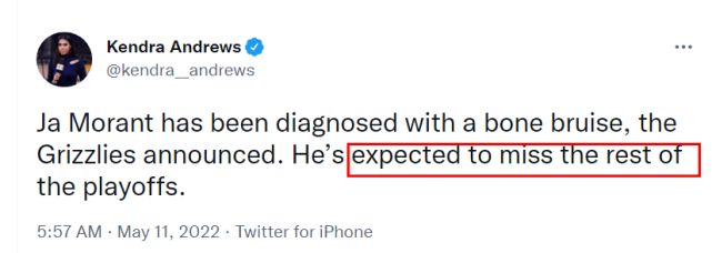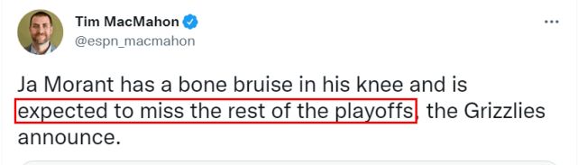 莫兰特在场边观看了双方G3的比赛,他并没有参加投篮训练,而且走路明显一瘸一拐。灰熊拖了很久才公布莫兰特的伤情,也引起不小的争议。NBA名记Tim MacMahon和Kendra Andrews都报道称,莫兰特预计赛季报销!