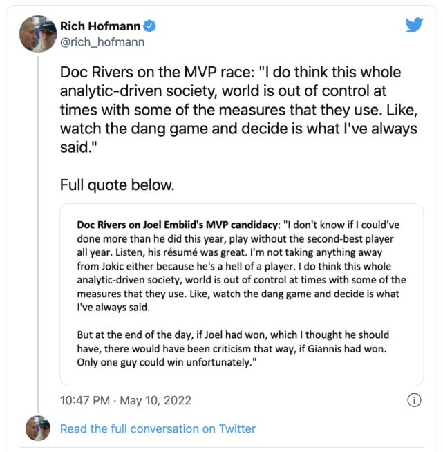 虽说约基奇从表现来看确实值得夺下这个奖项,但不少球迷甚至是媒体和联盟成员都认为恩比德更值得夺下常规赛MVP。对此,76任主教练道格-里弗斯就称赞了约基奇,但他也表示恩比德更应该夺下常规赛MVP: