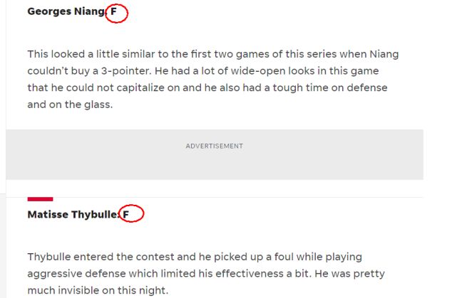恩比德被评了C-,他的评价写道:“没能拿到MVP,让恩比德想要证明自己,他打得很有侵略性,但尝试做太多事情,而且出现失误。两次险些受伤,热火在第三节很快领先20分,让恩比德无能为力。他在拼抢篮板方面有些懒惰。”恩比德本场比赛只抢到了5个篮板。