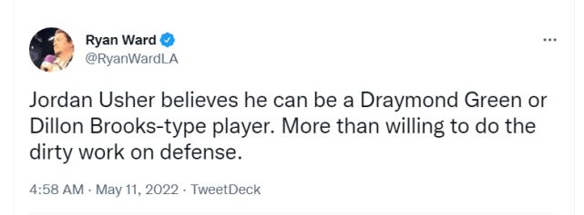 在今天的试训中,亚瑟身穿5号球衣,这是霍顿-塔克在湖人的号码。接受湖人记者采访时,亚瑟表示相信自己能成为一个追梦或者狄龙类型的球员。非常愿意在防守端干脏活累活。今年勇士和灰熊的系列赛,狄龙和追梦都曾经被驱逐出场,两人都是不惧怕身体对抗的球员,想必亚瑟也是这样的角色。