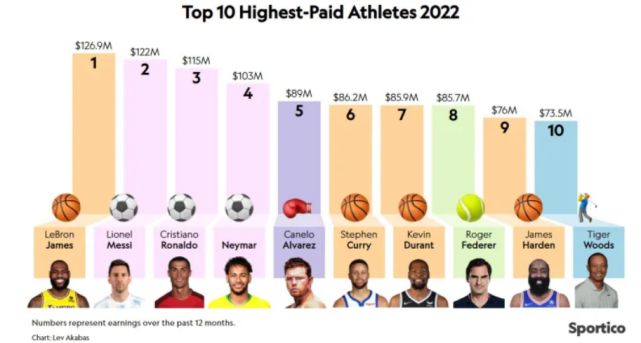 今天,著名体育财经网站Sportico发布了2022年度全球运动员年收入前100名榜单。湖人前锋勒布朗-詹姆斯以1.269亿美元登顶,排名全球运动员第一。詹姆斯去年排名第五,今年升至榜首。他的薪资3690万,场外收入9000万,合计1.269亿。排名第二至第九的依次是梅西、C罗、内马尔、阿瓦雷兹、库里、杜兰特、费德勒、哈登和伍兹。