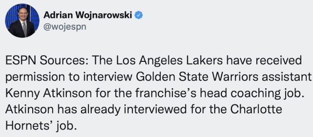 北京时间5月12日,当湖人依然在进行选帅工作,如今根据ESPN名记WOJ报道,湖人已经获得批准可以面试勇士助教阿特金森,而阿特金森此前已经面试了黄蜂的主教练职位。