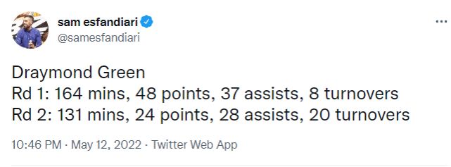 勇士一方,追梦的失误问题严重。NBA记者Sam esfandiari今日统计了追梦首轮与次轮的数据:首轮4比1击败掘金,追梦出战164分钟,得到48分37助攻,只有8次失误。次轮目前3比2领先灰熊,追梦出战131分钟,得到24分28助攻,但已有了高达20次失误。