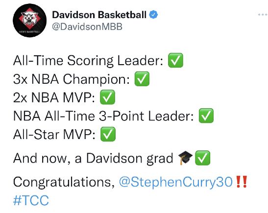 只是库里在大学只读了3年就进入NBA,而他当时还差一年就可以毕业。如今库里通过其余方式,找到过去曾经在戴维森学院教过自己的两位老师,其中一位目前就职于斯坦福大学,而另一位就职于加州大学圣克鲁兹分校,完成了春季学期的课程,从而让库里正式完成了自己的大学课程,他终于成功成为戴维森学院2022届社会学专业毕业生。