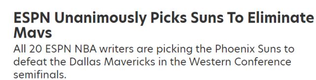 ESPN在每轮系列赛开打之前,均会有专家团进行集体预测,但太阳与独行侠的系列赛开打之前,专家团给出的预测是太阳20-0独行侠,竟然所有的专家全部看好太阳晋级,无疑是将独行侠给彻底看扁。