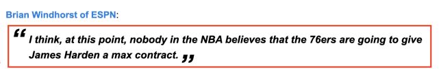 因为据ESPN记者布莱恩-温德霍斯特的说法,目前联盟中根本没人相信76人会给到哈登一份顶薪合同: