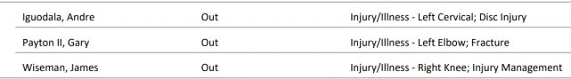 北京时间5月18日,勇士和独行侠进行训练,备战明天开打的西决首战。勇士在自己的训练馆进行训练,而独行侠则在大通中心进行训练。NBA官方伤病报告出炉,四名球员将缺席西决G1的比赛,独行侠一方缺席的是小哈达威,他已经因伤赛季报销,而勇士一方缺席的是伊戈达拉、小佩顿和怀斯曼。波特已经从伤病名单上消失,他预计能在G1复出。
